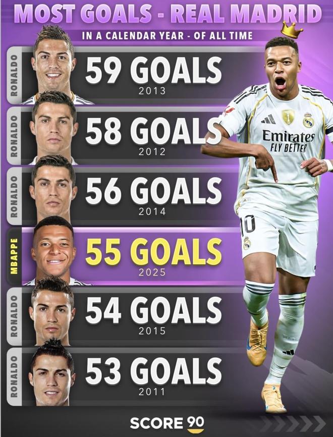 现在姆巴佩在2025年已经为皇马打进55球,距离C罗当年59球的纪录只差4球(数据截至北京时间今天)。按赛程看,皇马年底还有联赛、欧冠、国王杯等大概4–5场正式比赛,理论上给了他足够的刷分空间,只要正常出场,这个差距并不算大。